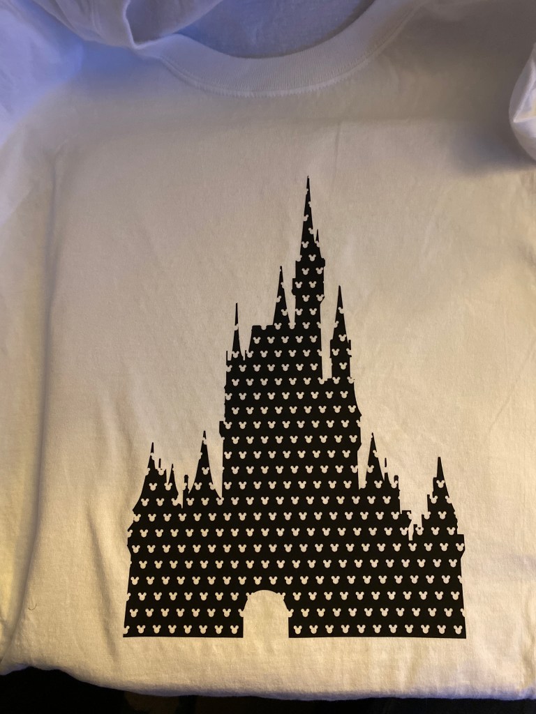 This one is cut from Cricut Everyday Iron-On Mesh Mickey vinyl. The SVG file for Cinderella’s Castle I got from the WDW Paper Tour blog, designed my Michelle Roth. That blog makes designs for paper craft, but the SVGs work just as well in the Cricut software to do any kind of material cut.