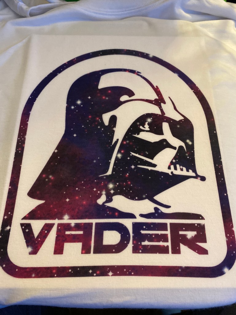 Darth Vader here was done using Cricut Infusible Ink Galactic Stars transfer sheet, with a design purchased from the Cricut Access image store. Cricut has lots of Disney owned stuff in their store…